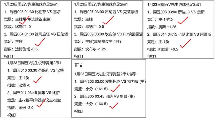 公推冲3连红近5中4,足篮整体命中6个2串1,其中篮球5组方案大红4串!