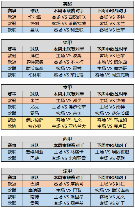从统计中不难看出,曾经辉煌的西甲逐渐没落(皇马的欧冠在下下周中),而英超三强也将陷入苦战,联赛和欧战都是客场,且对手实力都不弱。