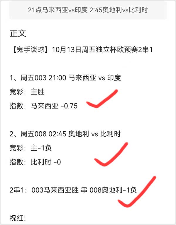 3个足球2串1拿到两个串子红单。早场两场友谊赛都是正路,日本4-1加拿大和韩国4-0突尼斯,两场主胜过关!晚间马来西亚的主胜和欧预赛奥地利的-1负先后命中拿下第2枚红单!