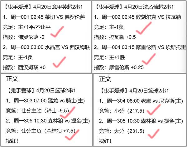 20日进神:足篮公推齐红!足篮28串红25串!主任足11串红10!篮球12串红11!北D红4串
