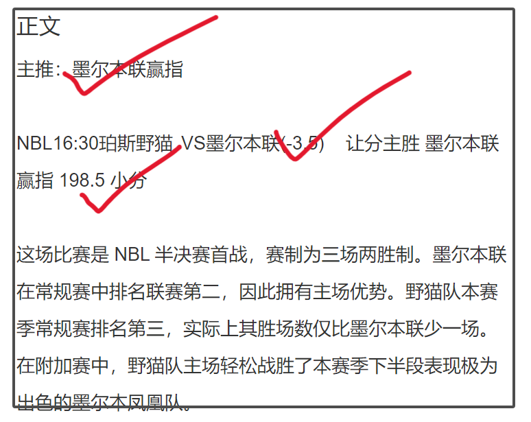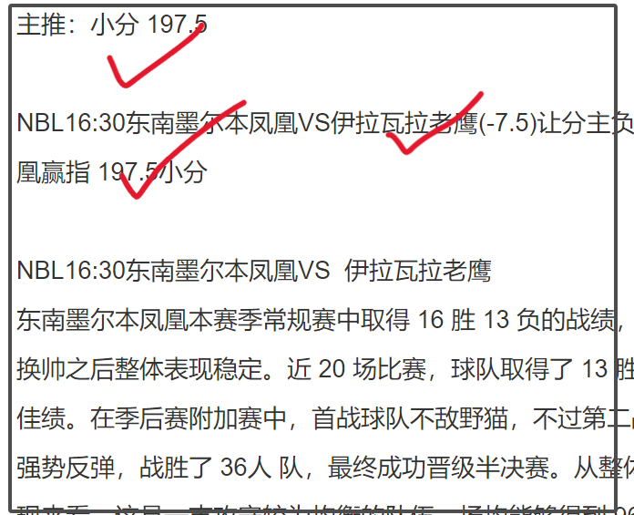 下午新鲜出炉的红单让分大小分全中NBL四连红: