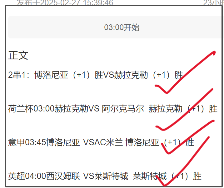 周三巴甲冲4连红,足篮命中6个2串1,单场9中8收两个3串1!