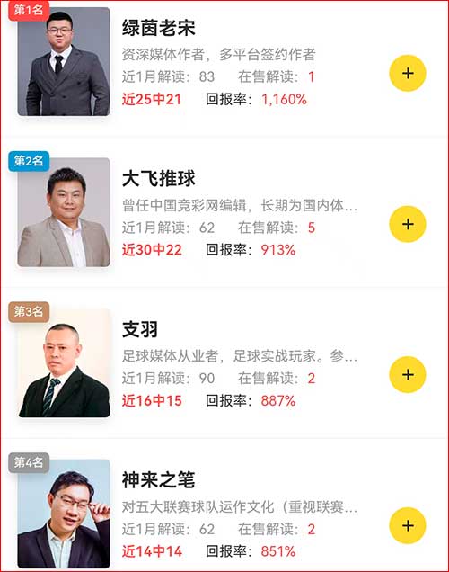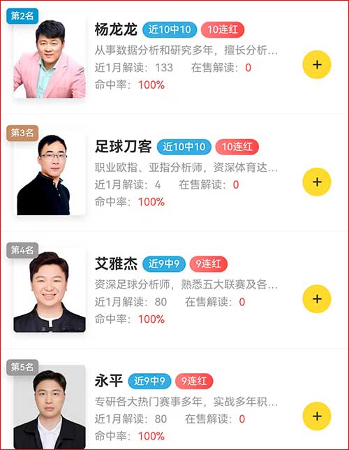 命中榜单上,【杨龙龙】和【足球刀客】两位专家解读10连红并列第二。杨龙龙欧冠场次9中9、英超解读6中6胜率完美,足球刀客长期战绩22中18胜率接近9成,收益超6倍。【艾雅杰】和【永平】两位专家同时拿到9连红的战绩排名榜单第三。其中艾雅杰世青赛7中7、欧冠6中6两项胜率完美;无独有偶,永平世青赛和欧冠都是7中7的完美表现。